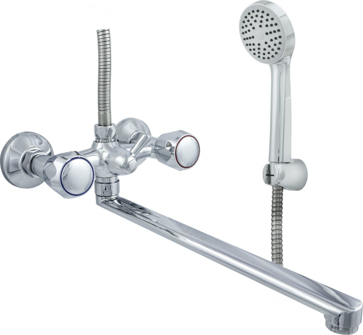 Смеситель для ванны ЦС-СМ 600/5-4К от подольской производственно-торговой группы "Центр Сантехники" предназначен для использования в ванных комнатах и представляет собой настенную конструкцию с двумя маховиками, плоским изливом и душевой лейкой на гибком шланге.