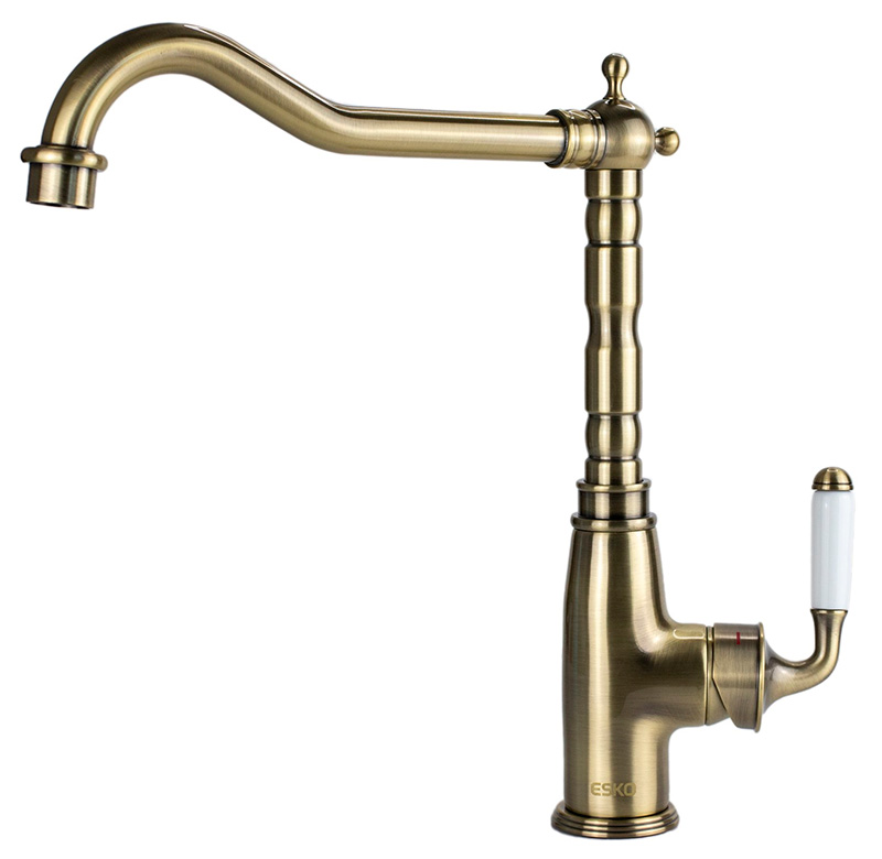 Корпус: латунь кат.A, покрытие "Бронза сатин" Излив: поворотный Картридж: универсальный ESKO, 35мм Комплектация: пьедестал, ребро жесткости, крепление "FastFix",гибкая подводка 40см.
