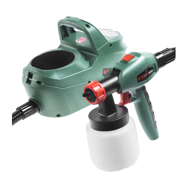 Предназначен для нанесения лакокрасочных материалов. Бак из ударостойкого химически инертного пластика, с возможностью визуально контролировать уровень наполнения. Эргономичная обрезиненная ручка для удобства работы. Мощный компрессор. Эластичный армированный шланг. Сопло позволяет изменить при необходимости форму факела в три пространственных положения. Разделённый компрессор и распылитель снижают вес, приходящийся на руки оператора. Наплечный ремень для удобства эксплуатации.