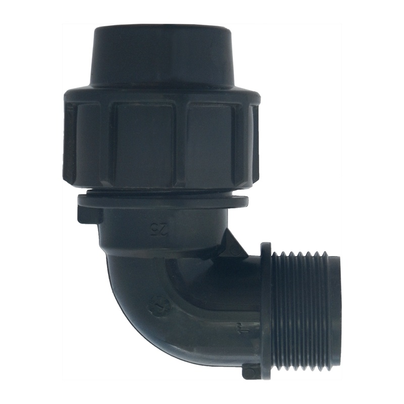 Отвод на 90 градусов для углового соединения труб d=25 мм и фитингов с наружной резьбой 1". Используются при монтаже труб из полиэтилена в различных местах трубопроводной системы таких как: повороты, одиночные и множественные разветвления, места, где полиэтиленовые трубы соединяются с трубами из других материалов, места, где трубы из полиэтилена соединяются с различной трубопроводной арматурой для поворота потока воды 90 градусов.